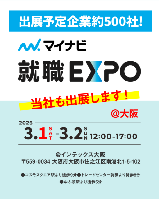 3月1日・2日で開催するマイナビ主催の「就活直前EXPO @インテックス大阪」に出展します。https://job.mynavi.jp/conts/event/2027/10444/index.html 出展日:3/1(日)12:00~17:00ブース:5号館557ぜひ当ブースへのご来場をお待ちしております!当社の魅力や仕事内容を知っていただき、就活準備にお役立てください!(ご来場には、入場予約が必要となりますのでご注意ください。) 一覧へもどる お知らせ 商品情報 メディア掲載 イベントレポート