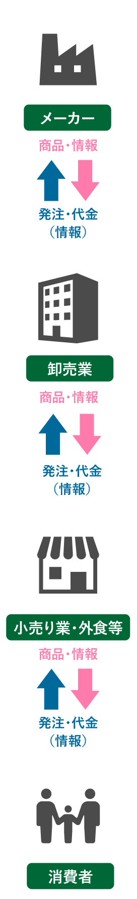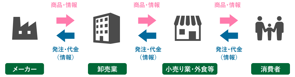 私たち食品商社は、生産者(メーカー)から大量に商品を仕入れ、小売企業や外食産業を営む企業へ必要な商品を必要なタイミングで届けることや、代金決済を請け負うといったリスクをとることでも、重要な責務を果たしています。 もし、我々のような食品卸売企業がなければ、小売店や外食産業、また一般の消費者が直接買い付けなければならないため、現在の市場価格は実現できないといった事態が起こる事も容易に予測できます。このような取引をメーカーや小売企業と行う事で、物流の効率化(最適化)が実現し、物流コストが削減され、最終的には消費者に、より安価で安全な商品を届けることが可能になるのです。また、卸売企業だからこそ可能な情報提供、商品の企画から提案、また商品管理を徹底する事で、安心・安全で、しかも豊かな「食」の提供を実現する事ができるのです。