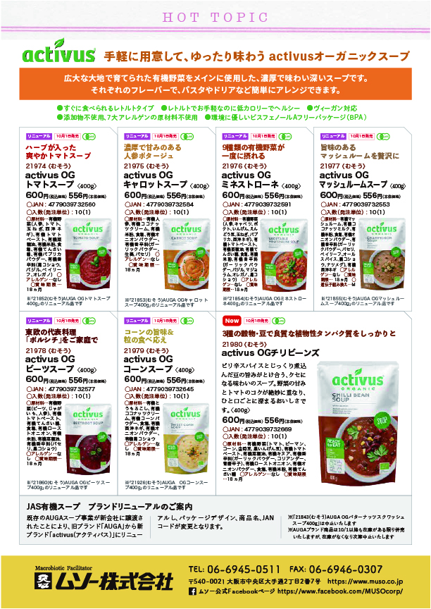 既存のAUGAスープ事業が新会社に譲渡されたことにより、旧ブランド「AUGA」から新ブランド「activus(アクティバス)」にリニューアルし、パッケージデザイン、商品名、JANコードが変更となります。※「21843(むそう)AUGA OGバターナッツスクワッシュスープ400g」は中止いたします。※AUGAブランド商品は10/1以降も在庫がある限り併売いたしますが、在庫がなくなり次第中止いたします