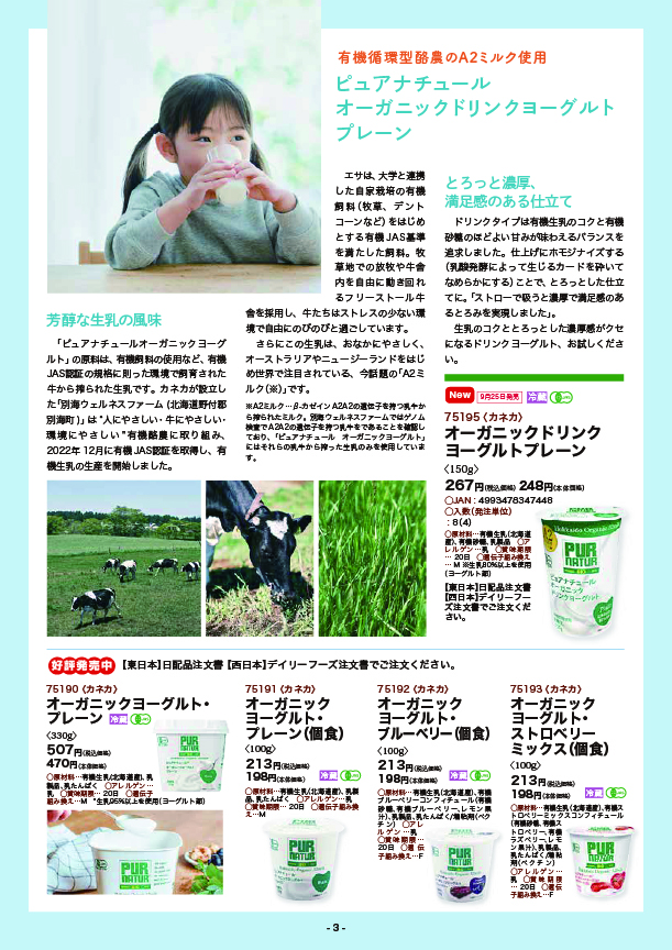 ※A2ミルク…β-カゼインA2A2の遺伝子を持つ乳牛から搾られたミルク。別海ウェルネスファームではゲノム検査でA2A2の遺伝子を持つ乳牛をであることを確認しており、「ピュアナチュール オーガニックヨーグルト」にはそれらの乳牛から搾った生乳のみを使用しています。