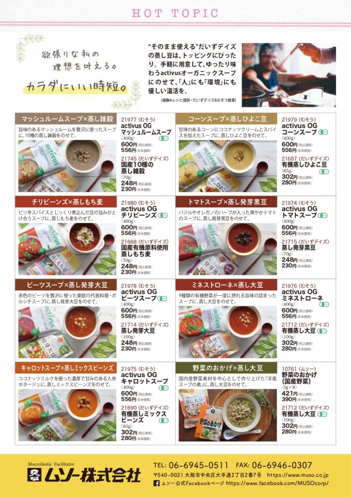 “そのまま使える”だいずデイズの蒸し豆は、トッピングにぴったり。手軽に用意して、ゆったり味わうactivusオーガニックスープにのせて、「人」にも「環境」にも優しい温活を。(画像&レシピ提供・だいずデイズ&カネカ食品&むそう商事)