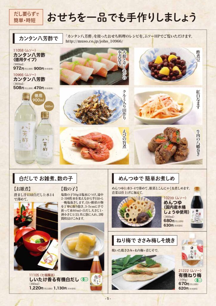 カンタン八芳酢」を使ったおせち料理のレシピを、ムソーHPでご覧いただけます。