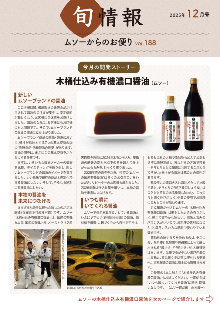 さまざまな条件に最も合致したのが足立醸造(兵庫県多可郡多可町)です。ムソー「木桶仕込み有機濃口醤油」は、国産の有機丸大豆、国産の有機小麦、オーストラリア産天日塩を原料に2024年3月に仕込み、奥播州の酷暑の夏と氷点下の冬を超えて仕上がったもろみを、じっくり搾りました。2025年春の新発売以来、待望の“ムソーの国産有機醤油”は多くのお引き合いをいただき、リピーターのお客様も増えました。2026年春は仕込み量を増やし、本物の醤油を未来につなげます。