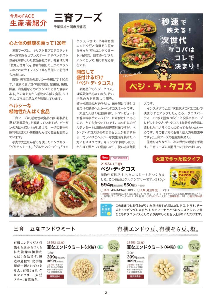 インスタグラムに“次世代タコパはコレで決まり!”とアップしたところ、タコスパーティーの“映え画像”がどっと投稿されて、プレゼント(ベジ・デ・タコス1年分!)の発送に追われた由。「多くの人に知ってもらいたい一心です。今の若い方にも響く伝え方を模索中です」と三育フーズの金城裕規さん。信念を守りながら、次の世代に希望を手渡す。三育フーズの真面目さに打たれました。