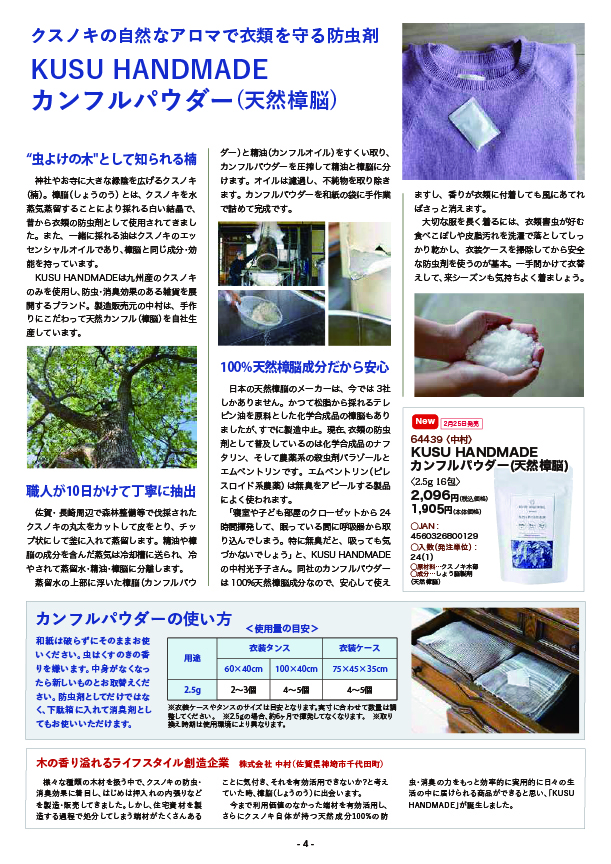 様々な種類の木材を扱う中で、クスノキの防虫・消臭効果に着目し、はじめは押入れの内張りなどを製造・販売してきました。しかし、住宅資材を製造する過程で処分してしまう端材がたくさんあることに気付き、それを有効活用できないか?と考えていた時、樟脳(しょうのう)に出会います。今まで利用価値のなかった端材を有効活用し、さらにクスノキ自体が持つ天然成分100%の防虫・消臭の力をもっと効率的に実用的に日々の生活の中に届けられる商品ができると思い、「KUSU HANDMADE」が誕生しました。