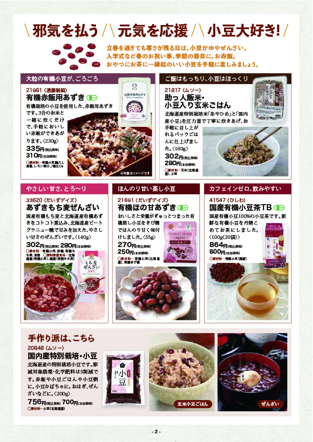 立春を過ぎても寒さが残る日は、小豆がゆやぜんざい。入学式など春のお祝い事、季節の節目に、お赤飯。おやつにお茶に…縁起のいい小豆を手軽に楽しみましょう。