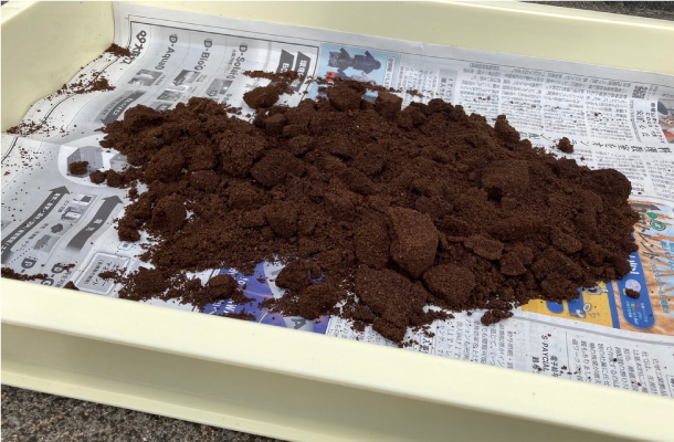 「社内で出たコーヒーやお茶の出がらしをそのまま捨てるなんてもったいない!」から生まれたコーヒーかす活用プロジェクト。