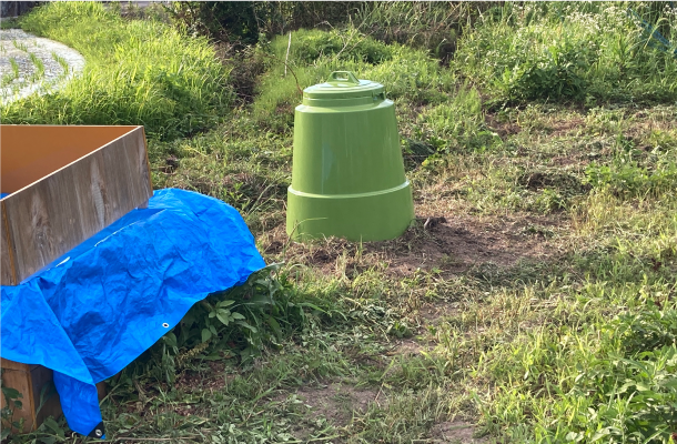 コーヒーカス、番茶や麦茶・紅茶の茶葉を集めて屋上で天日干しし乾燥させます。その後ムソーが管理している農園で、コンポストに入れて堆肥にし、また畑に戻すという活動を行っています。